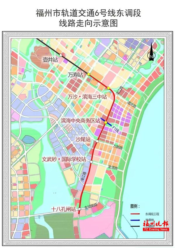 6号线东调段作为福州轨道交通线网的重要延伸,起始于6号线一期终点站万寿站,终止于滨海新城的十八孔闸站,线路单线全长约5.55千米,共设置万沙·滨海三中站、滨海中央商务区站、沙尾站、文武砂·国际学校站、十八孔闸站5座车站,均采用地下线敷设方式。